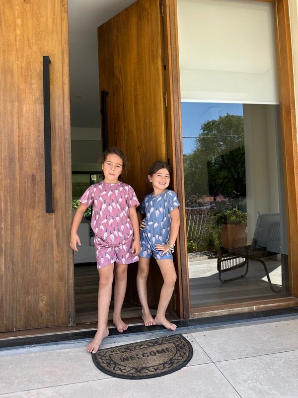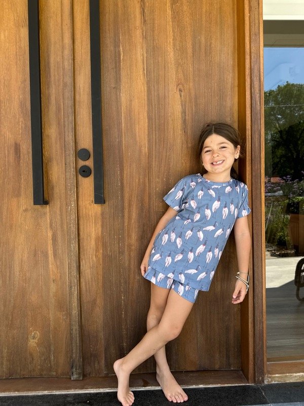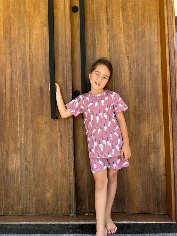 Pijama dos piezas remera y short, estampa jabiru en fondo celeste y rosa viejo.